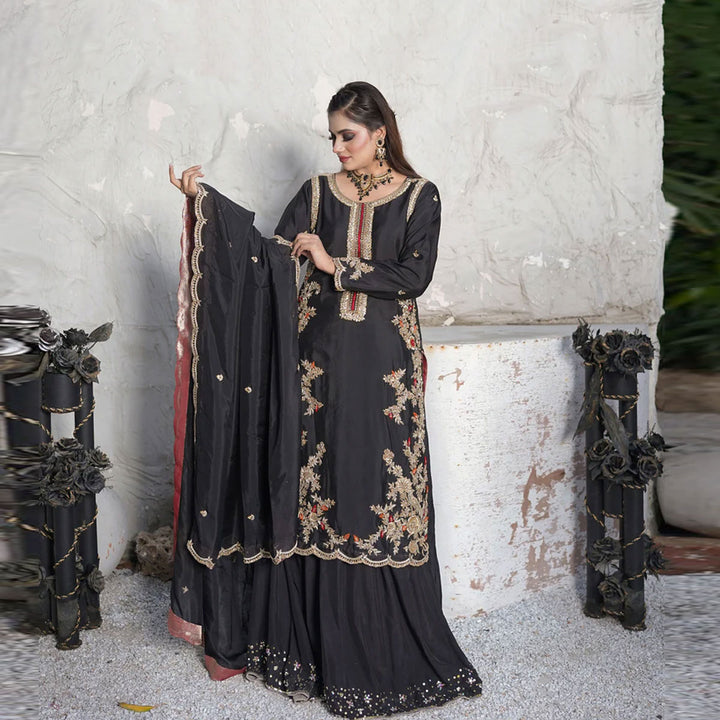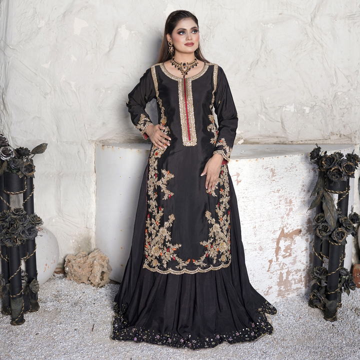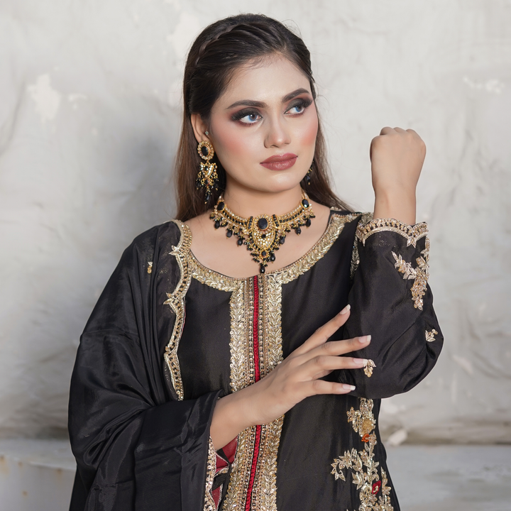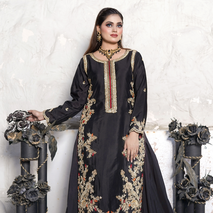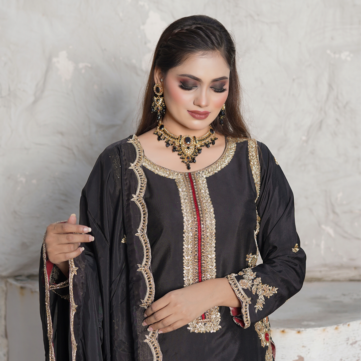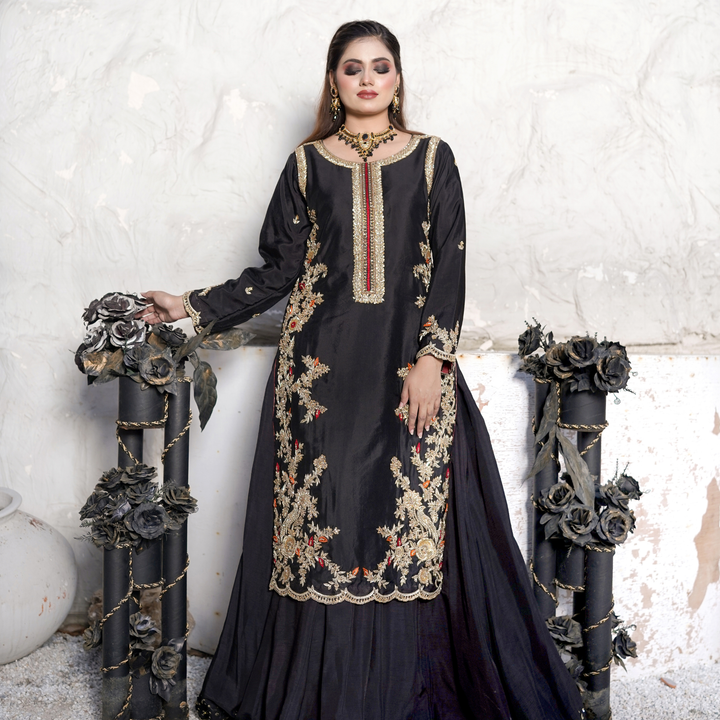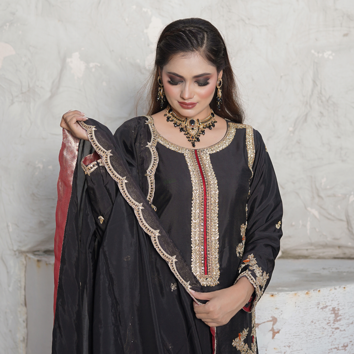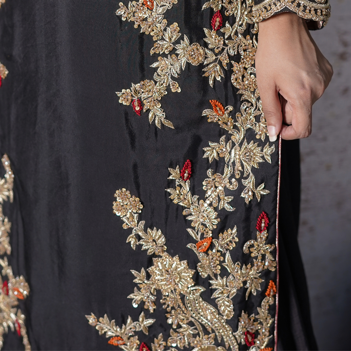 Dark and devine detailed-this black ensemble is an ode to simplicity. The shirt is a canvas of artistry, where red and orange threadwork meets glided gold zari and sequins in an opulent fusion. Intricate embroidery graces the silhouette, while scalloped edging along the hem adds a soft, sculptural finish-like lacework carved from midnight. Paired with a beautifully embroidered dupatta that echoes the same scalloped finess.