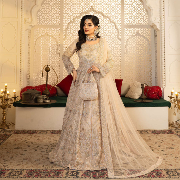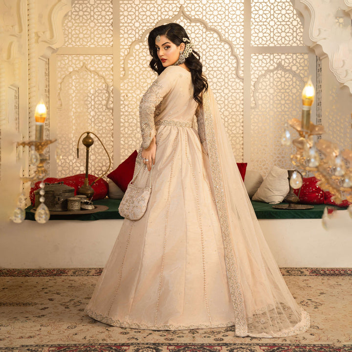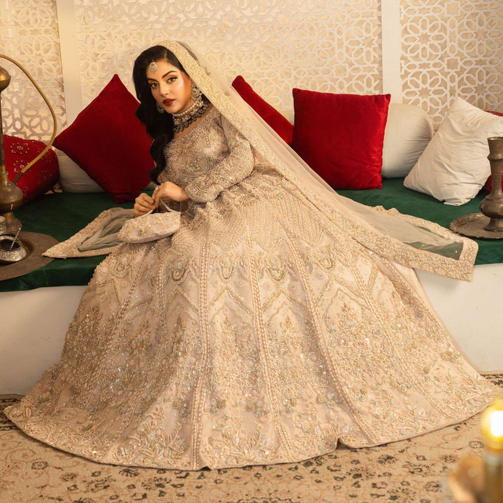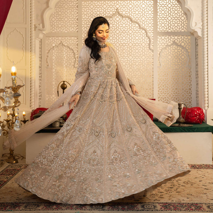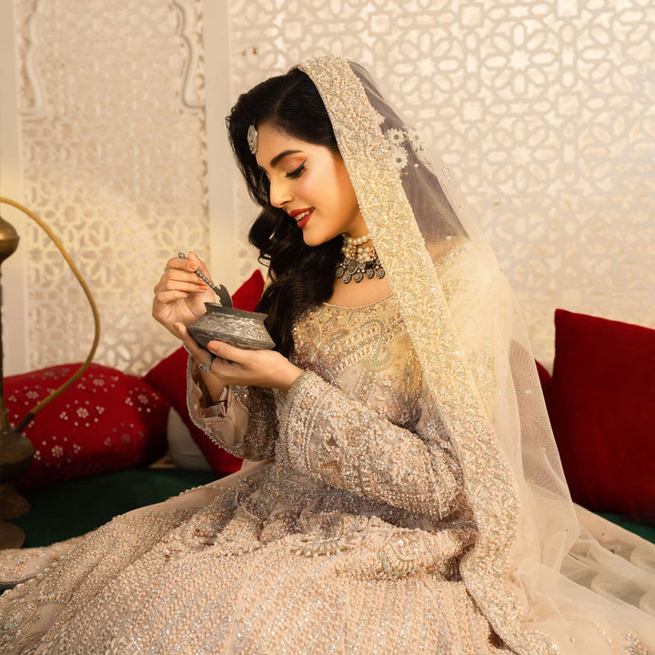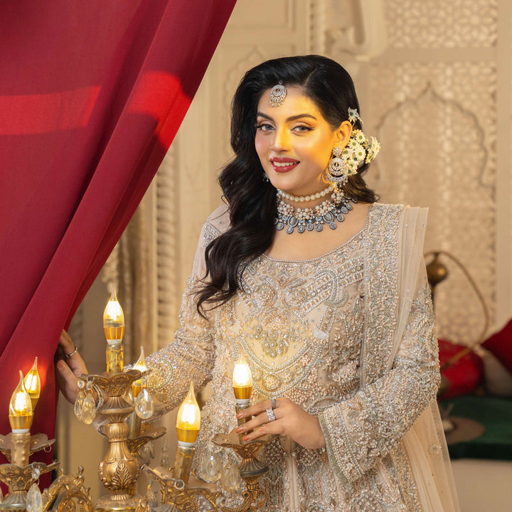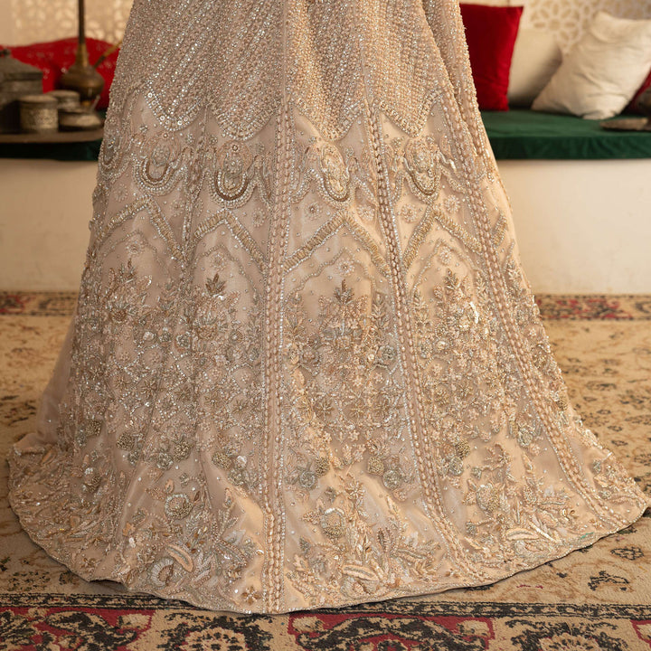 The intricate zardozi embroidery, handwoven with shimmering sequins and beads, creates a stunning display of artistry, while crystals and pearls accents add a soft, luminous touch.