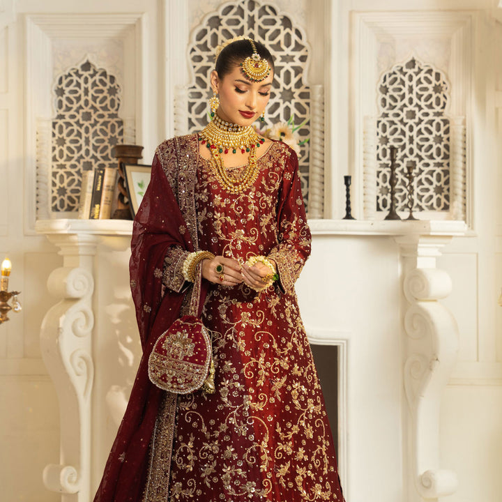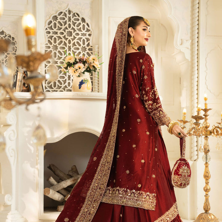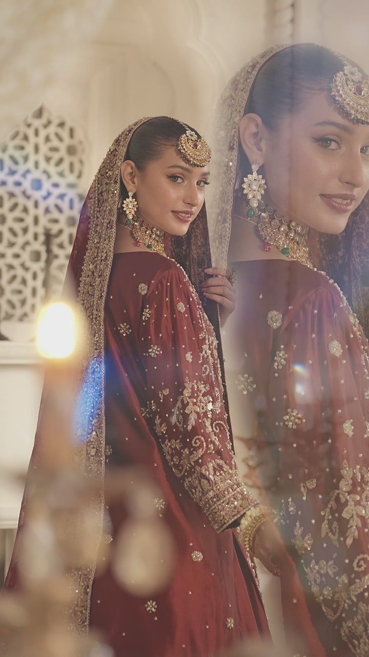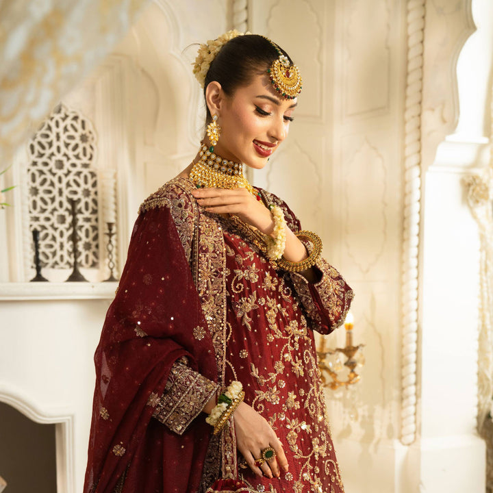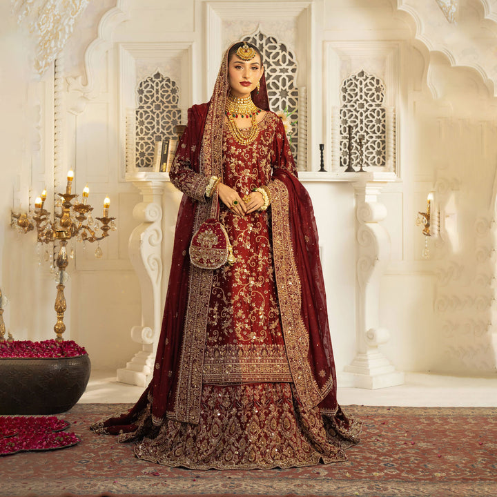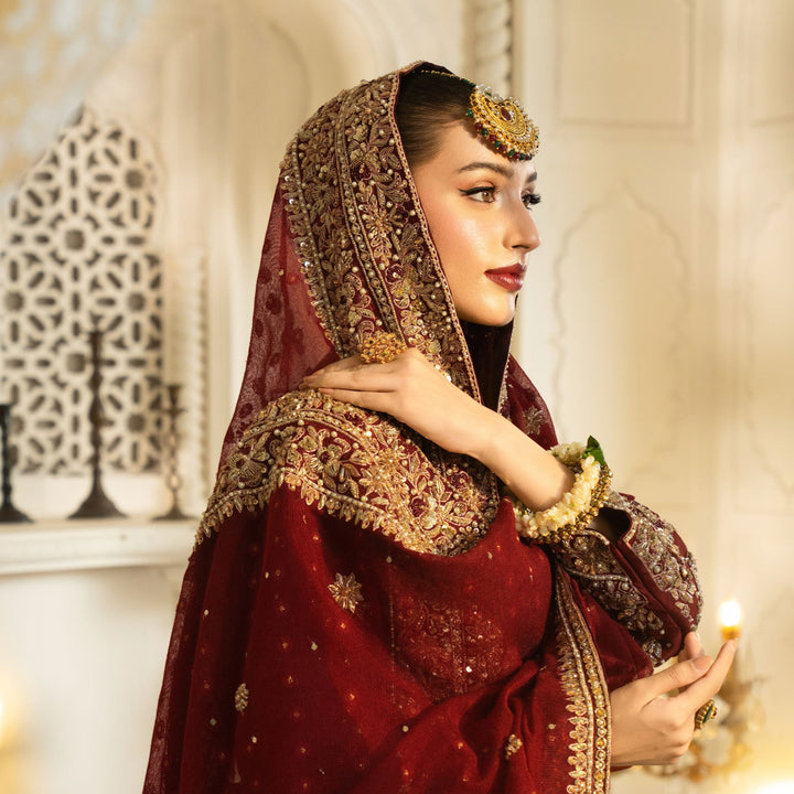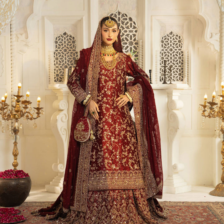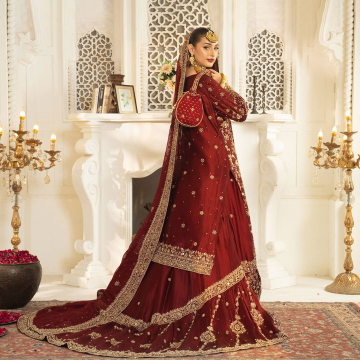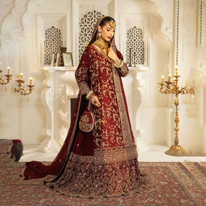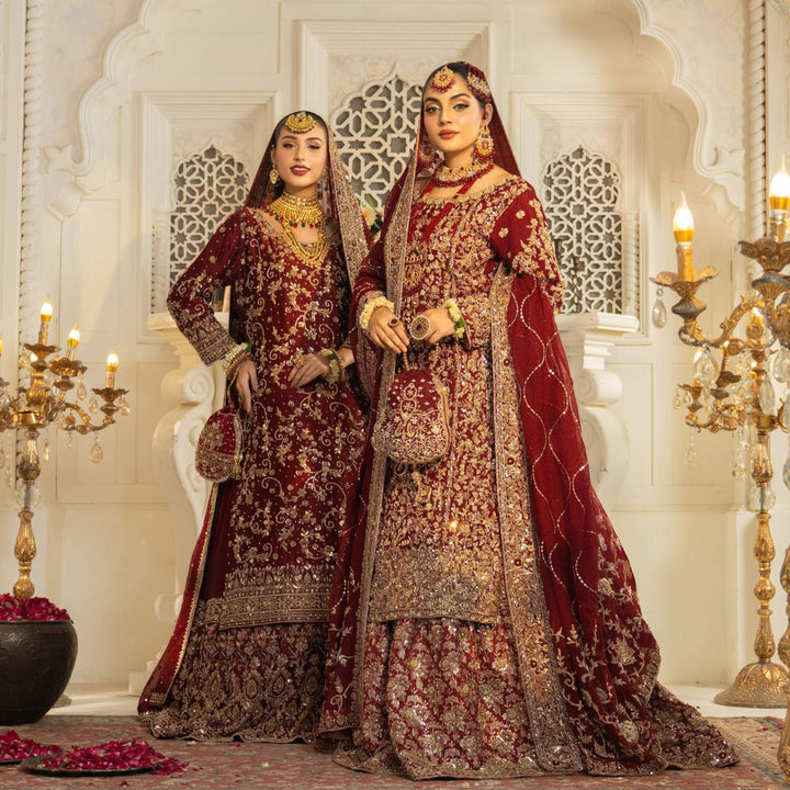 This blood red farshi lehnga paired with a gracefully long shirt, complemented by a deicate border dubata. This timeless ensemble is adorned with traditional zardozi craftmaship, featuring intricate dabka, nakshi, crystal, sequins, metallic pipes and sparkling embellishments. This outfit embodies regal charm and artisanal finess.