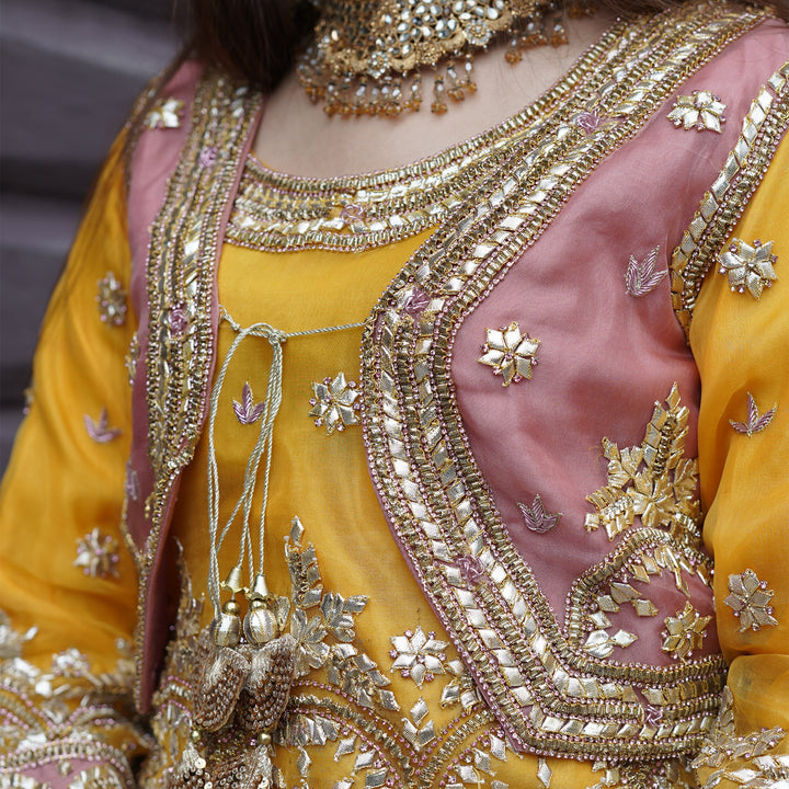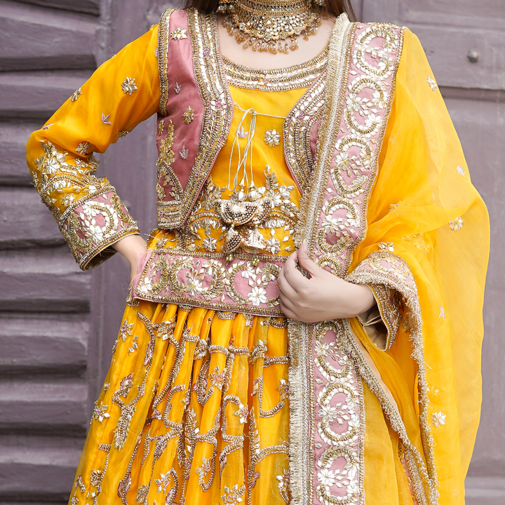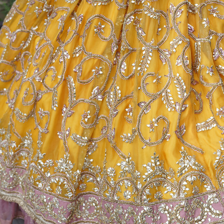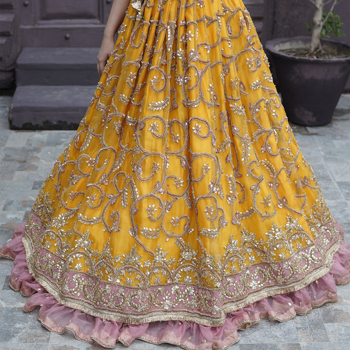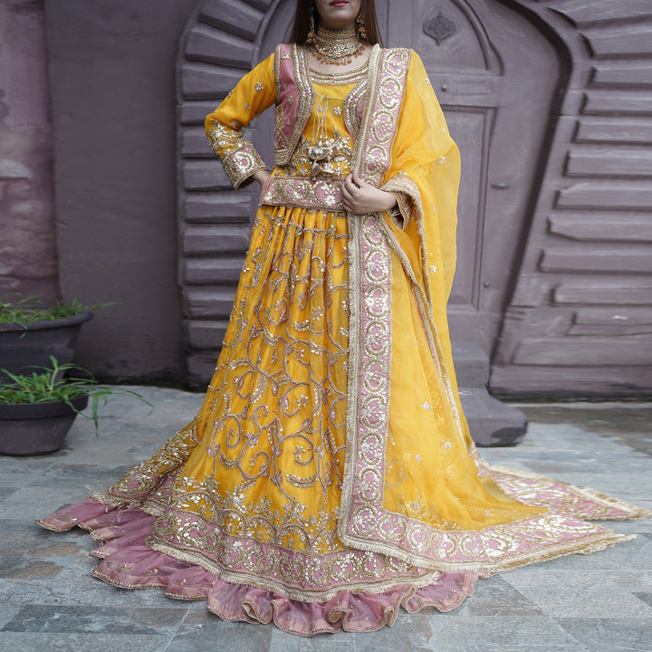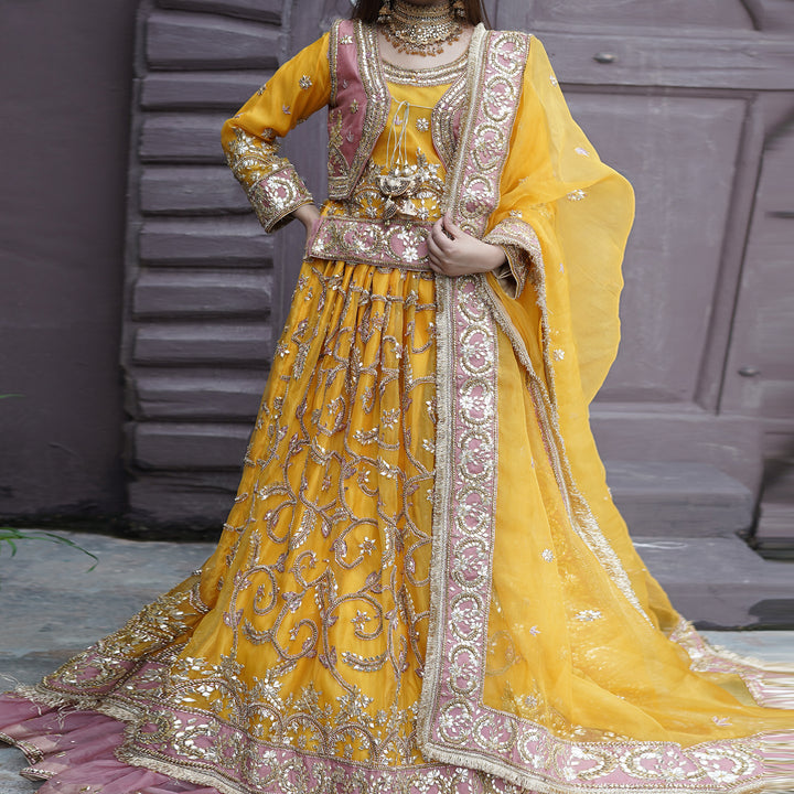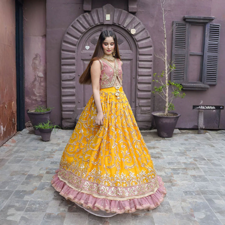 This lehnga features a golden yellow base with a pink overlay. Showcasing a beautiful floral pattern and a four sided border dupatta. This outfit is complemented by a matching golden-yellow lehnga with a chatta patti border, adding a touch of traditional elegance.
