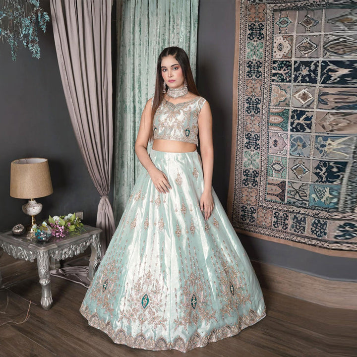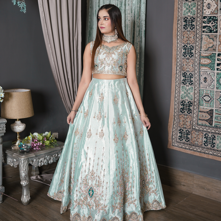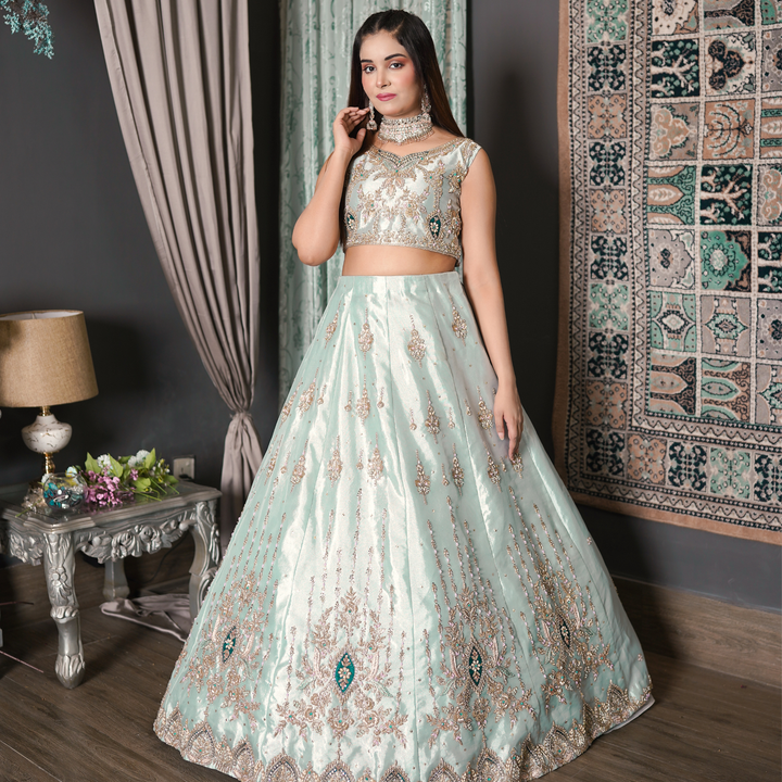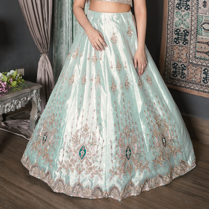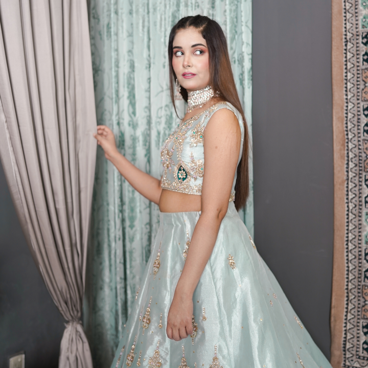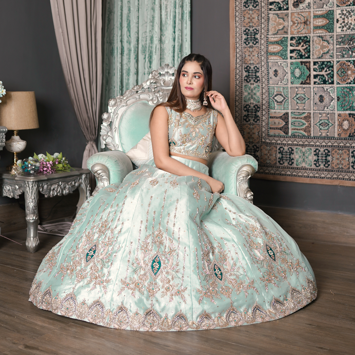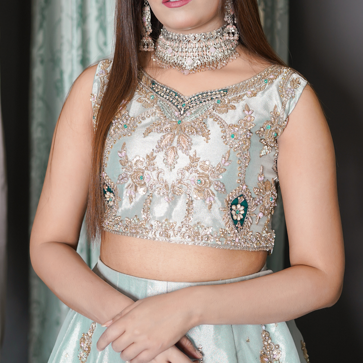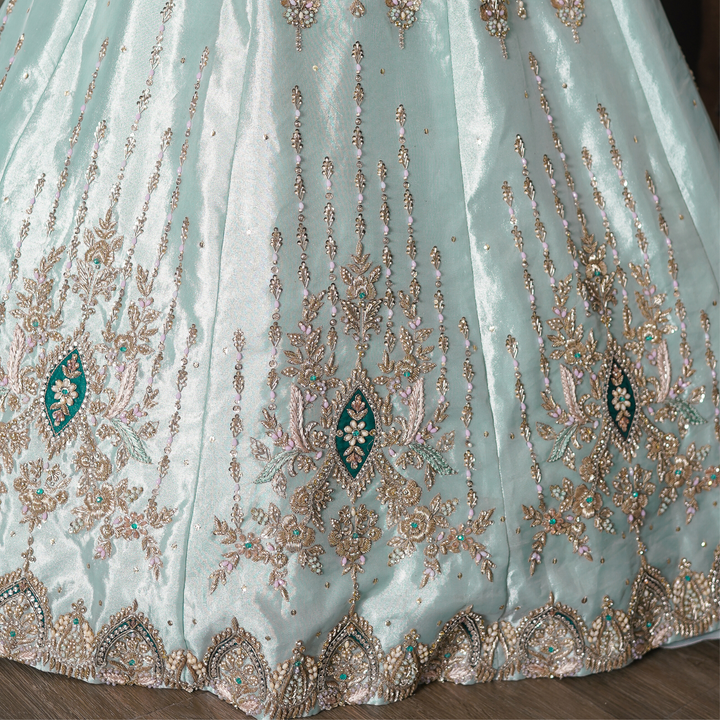 Hued in the coolest shade of blue, this bridal is truly what a dreams are made of. Crafted luxuriously ingold metal work and accentuated with dainty pearls and crystals, the femininity of this one is unmatched.