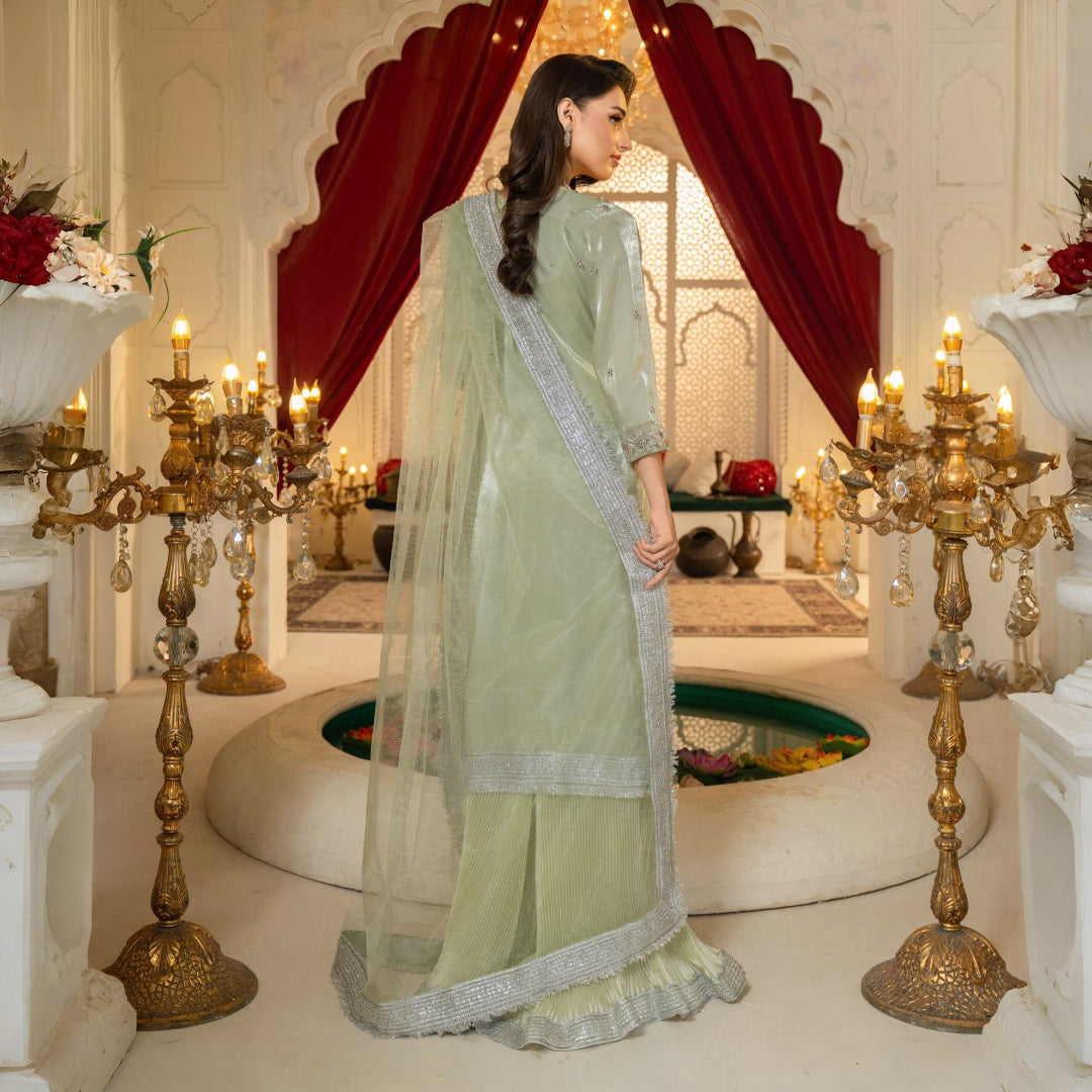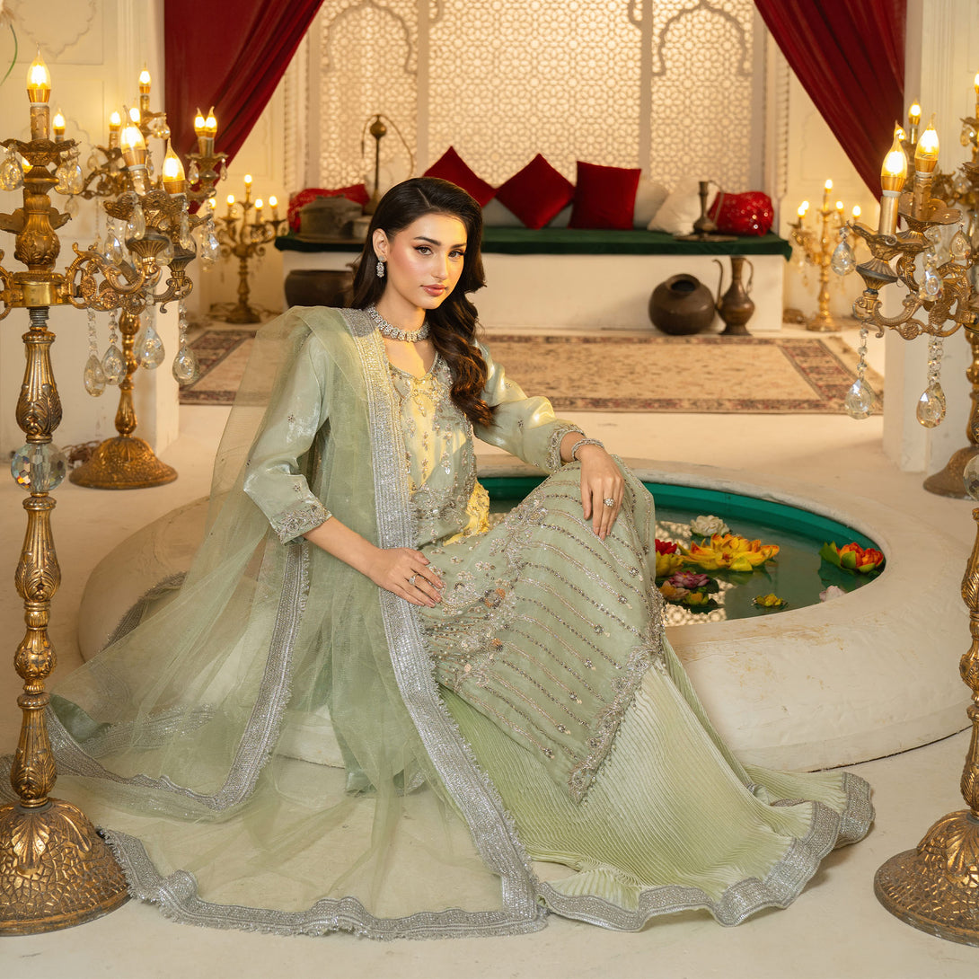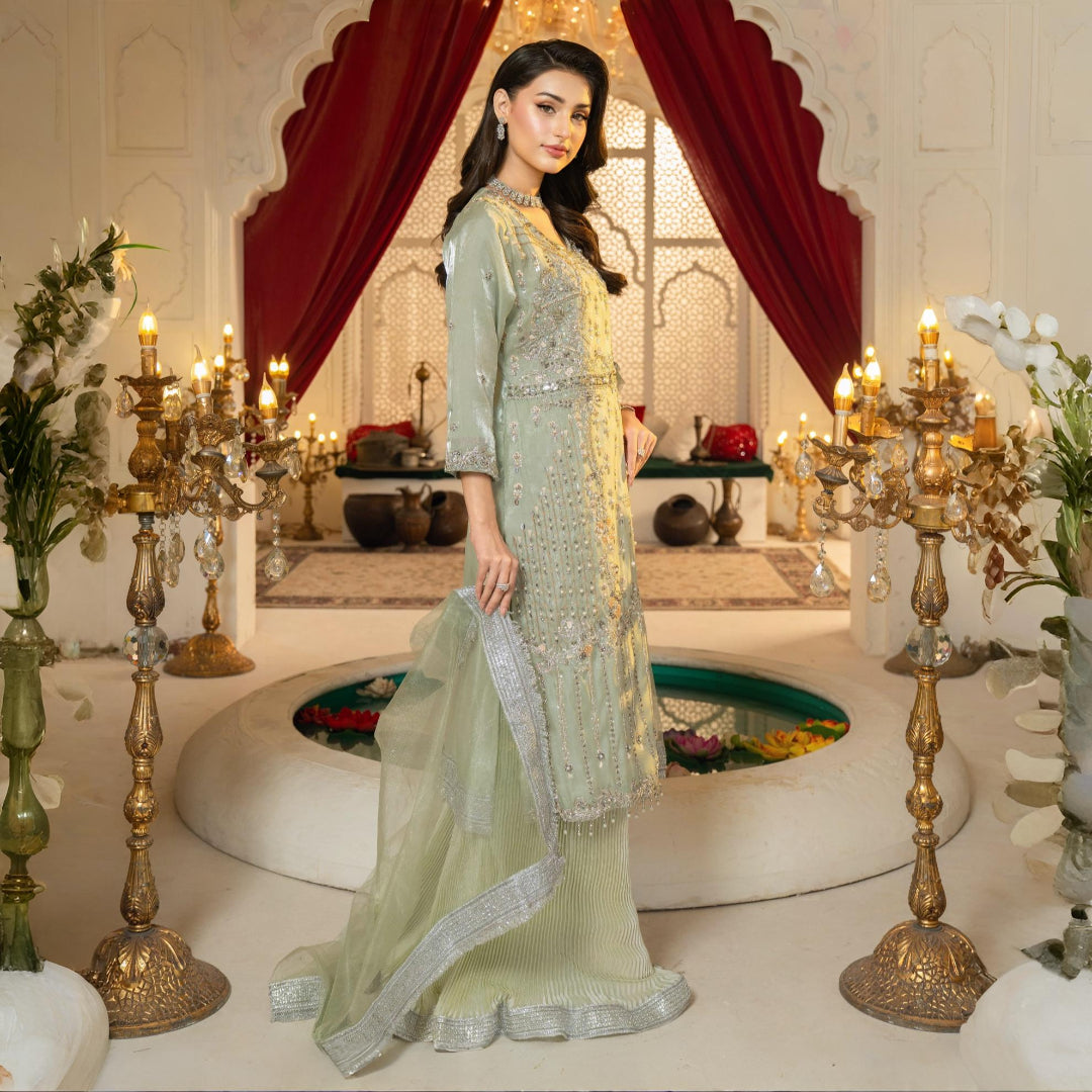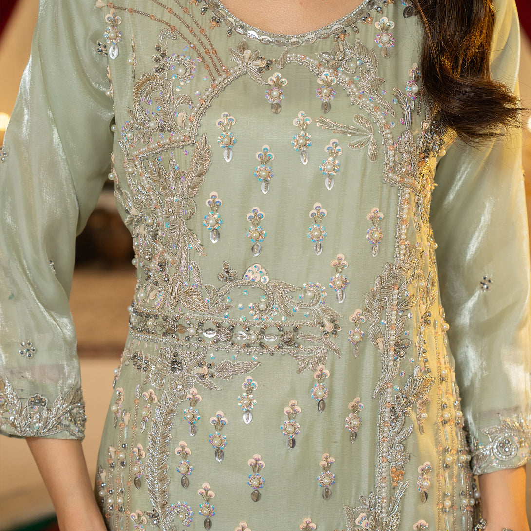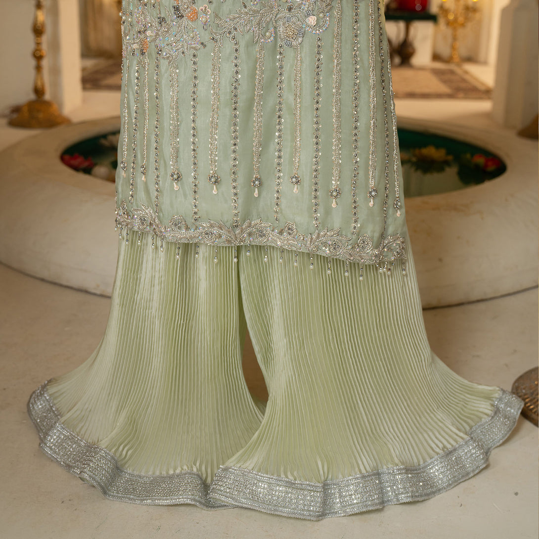 A pistachio green long shirt, complemented by a delicate crush sharara. This timeless ensemble is adorned with traditional zardozi craftsmanship, featuring intricate dabka, nakshi, crystal, sequins and sparkling embellishments. Dubata finishing with four sided lace.