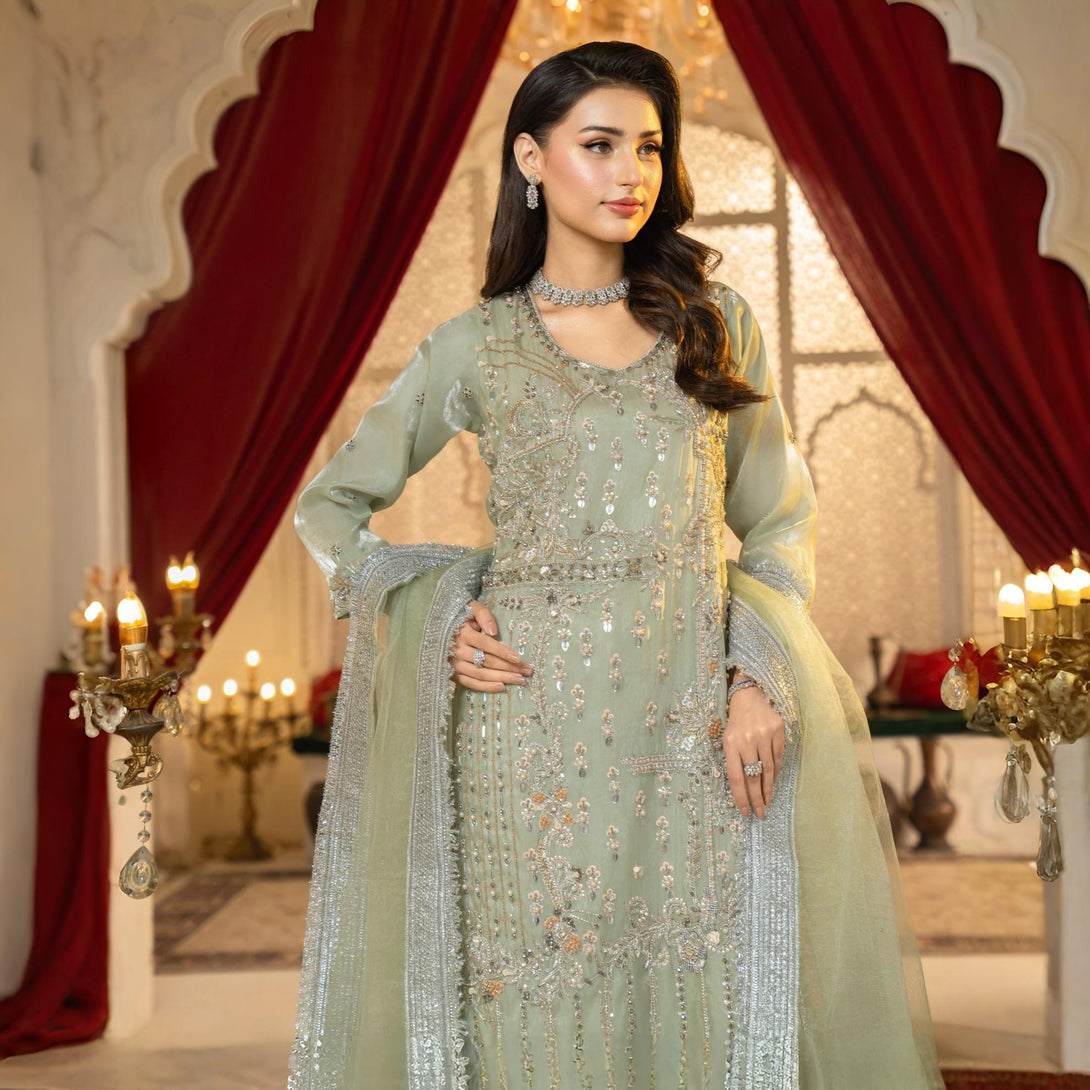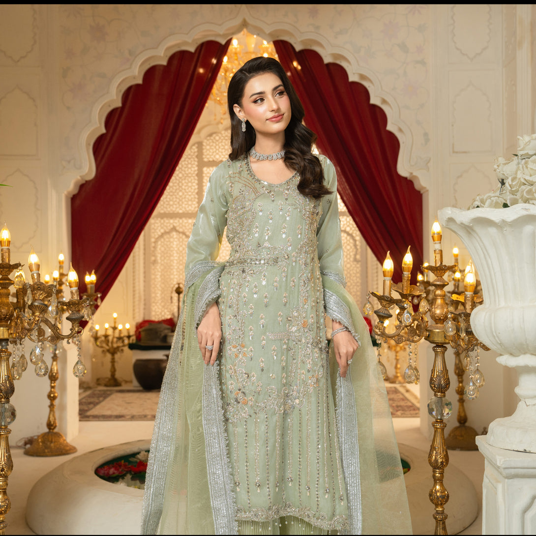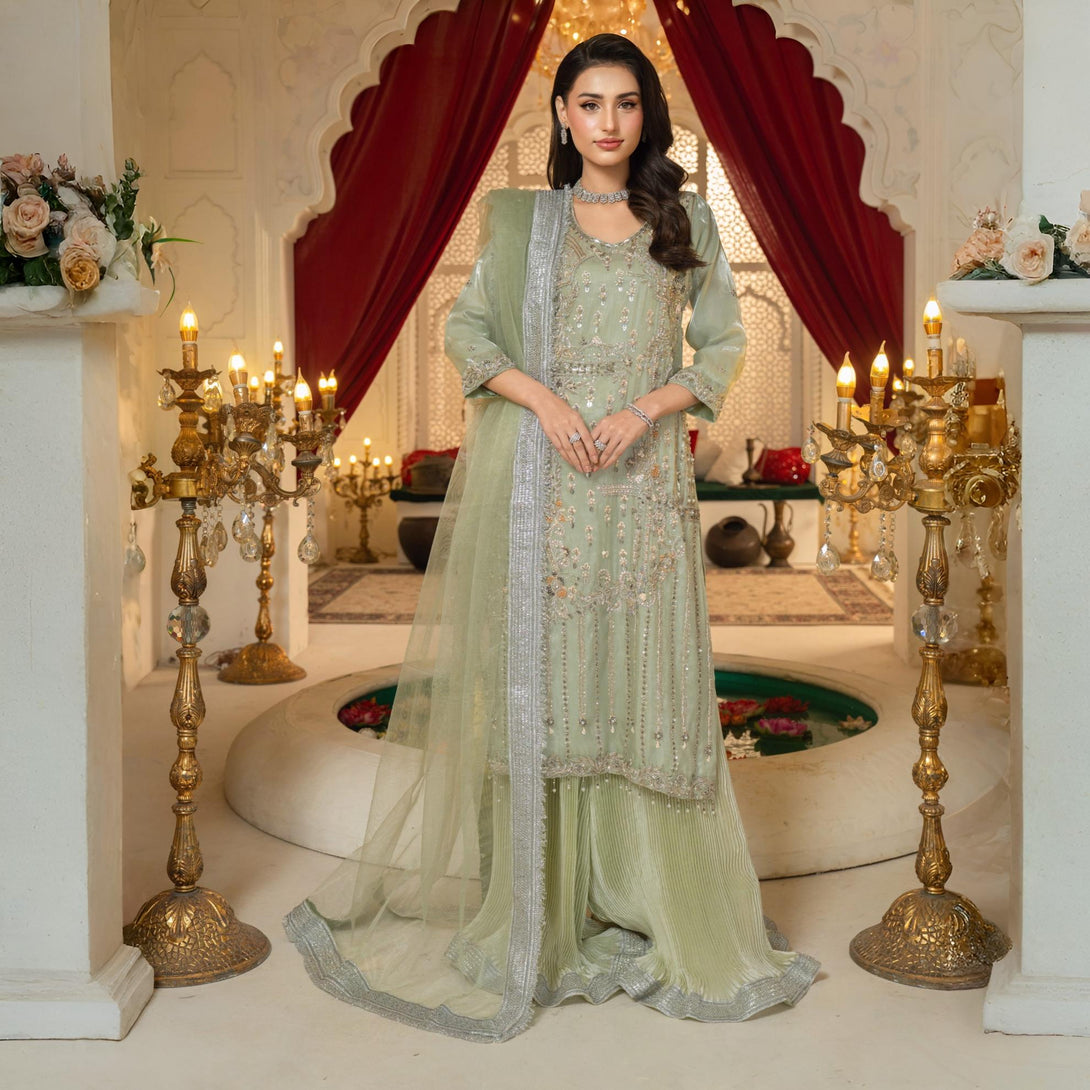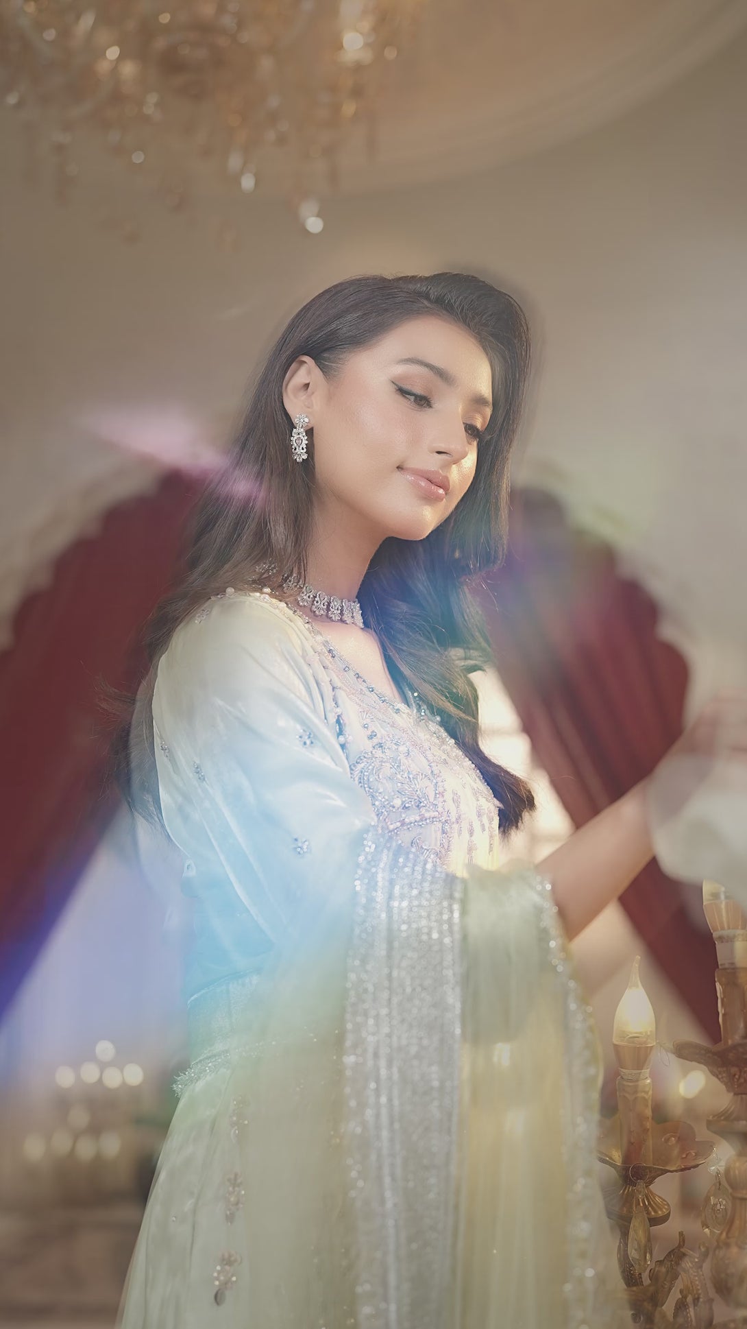 A pistachio green long shirt, complemented by a delicate crush sharara. This timeless ensemble is adorned with traditional zardozi craftsmanship, featuring intricate dabka, nakshi, crystal, sequins and sparkling embellishments. Dubata finishing with four sided lace.
