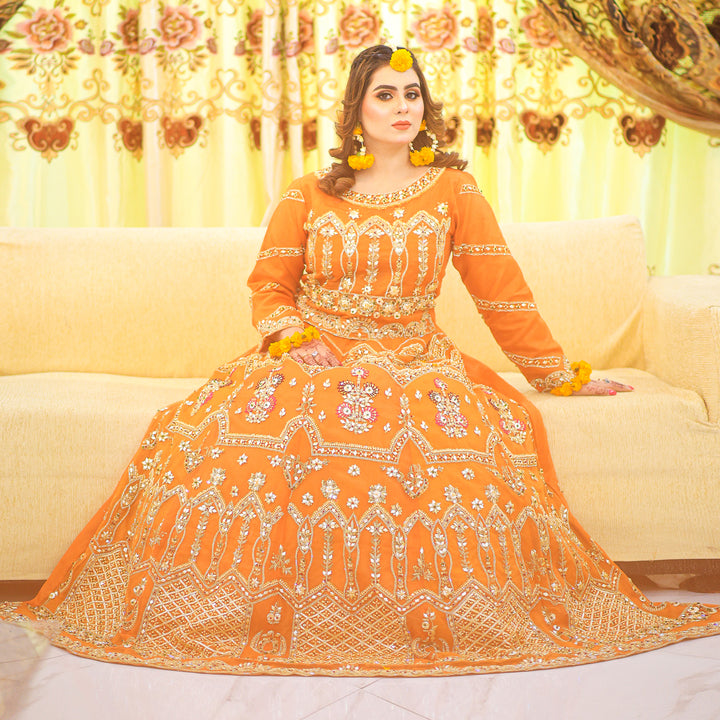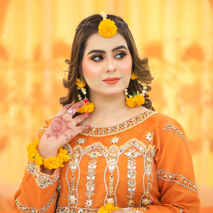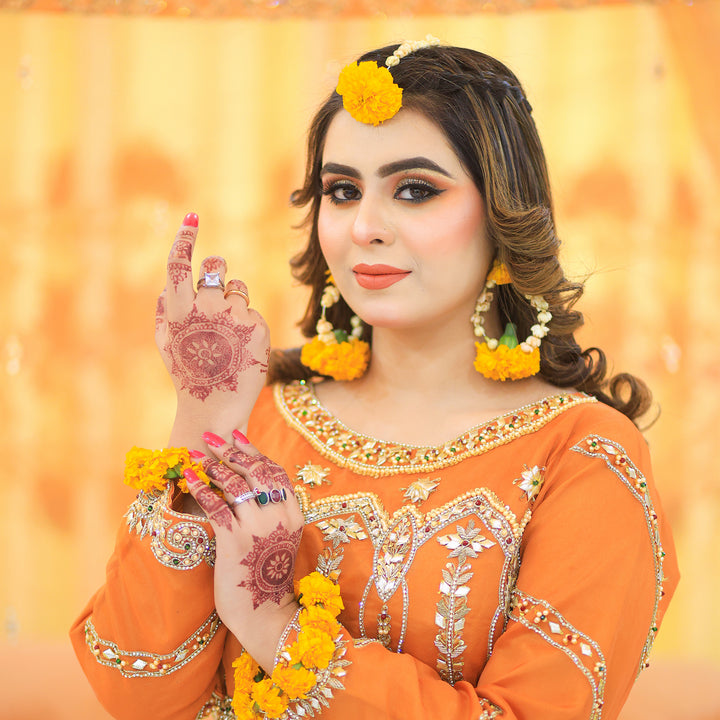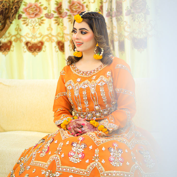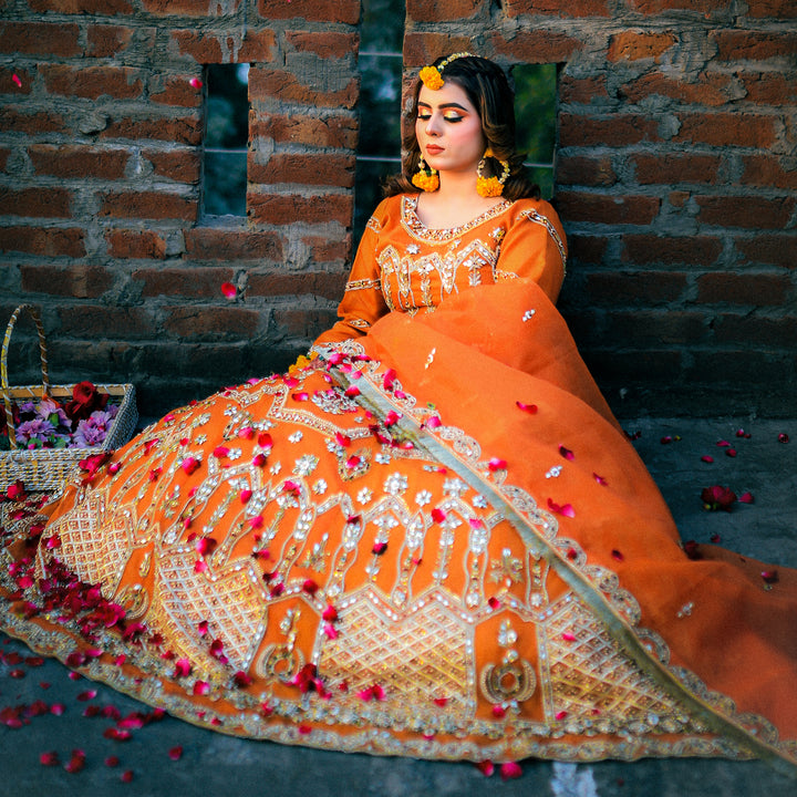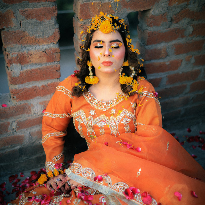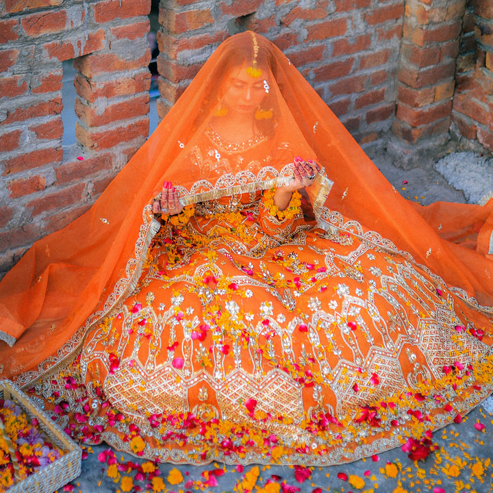 This majestic bright orange lehnga choli boasts modern gotta work and elegance with a beautifully draped dubata. These intricate details creates a mesmerizing design that adds a touch of elegance and graduer to any outfit.