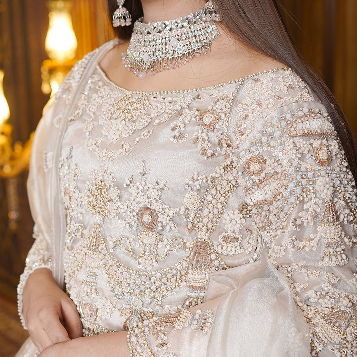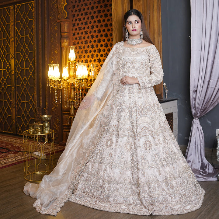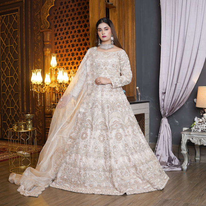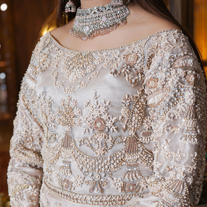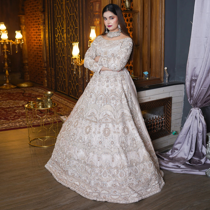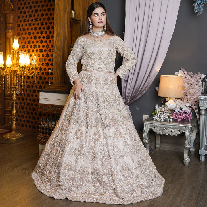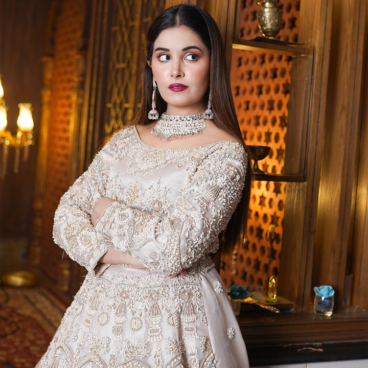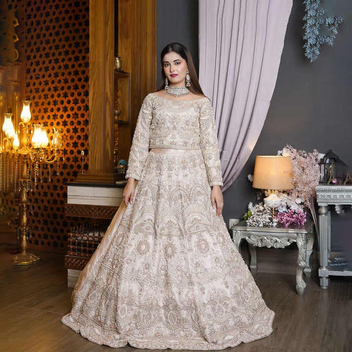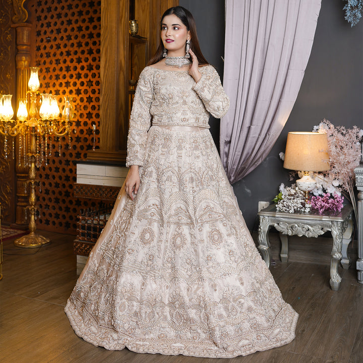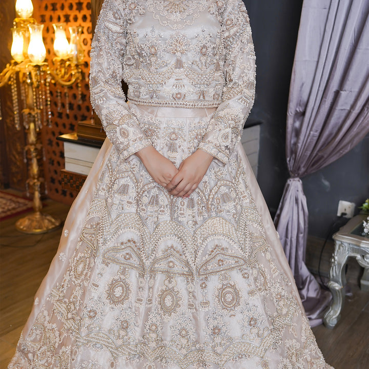 Mauvelous bridal lehnga with a beautiful assortment of hand fabricated floral vines scrabbling up till the waist lined with brocade to lift the details. The choli is hand worked with 3D flowers and beautiful bunches on the sleeves comes with a fully worked bridal dupatta with heavy four sided borders.