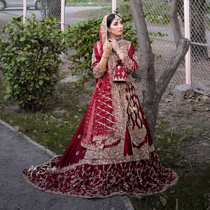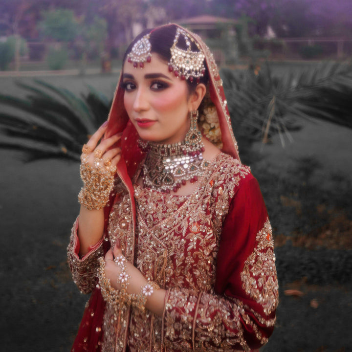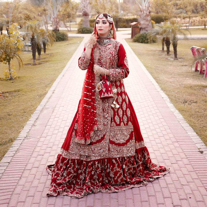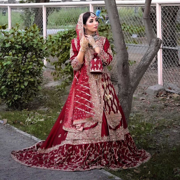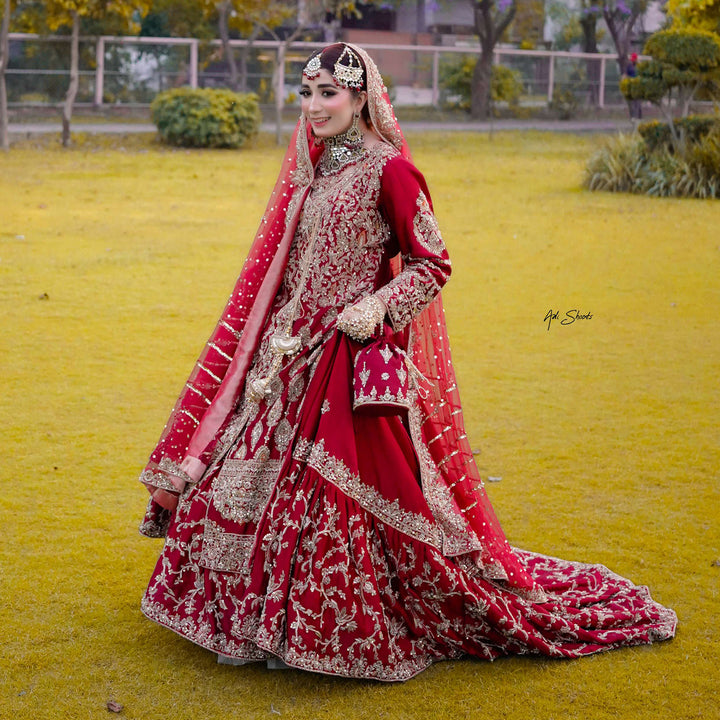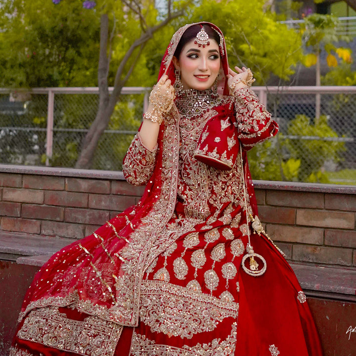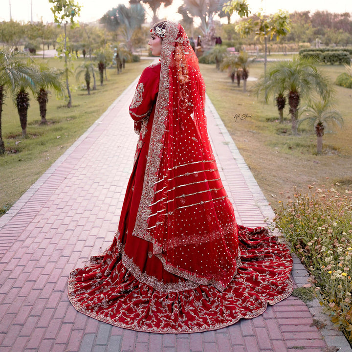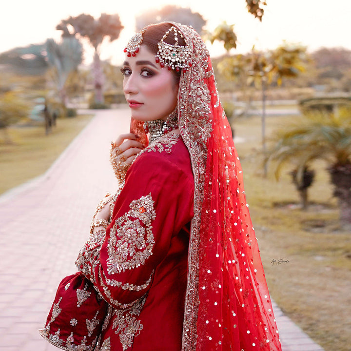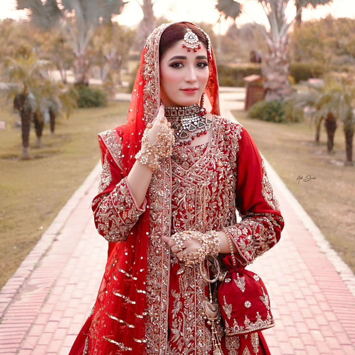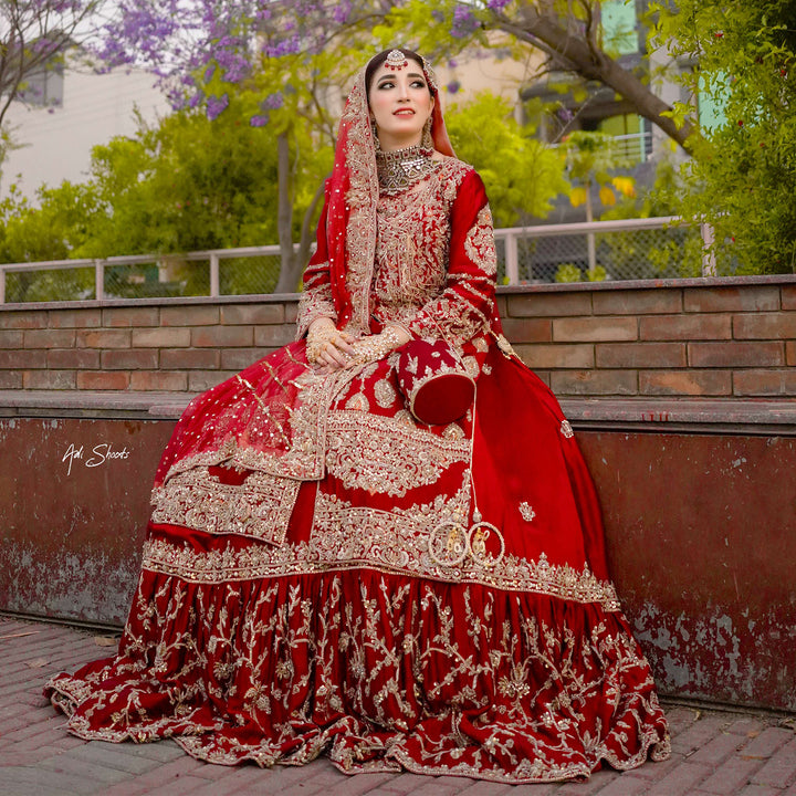 A three piece bright red bridal featuring traditional floral motifs and vines rendered using dabka and resham zardozi among other techniques. Hand crafted with meticulous care, our pieces have a lot deigence and love invested in them.