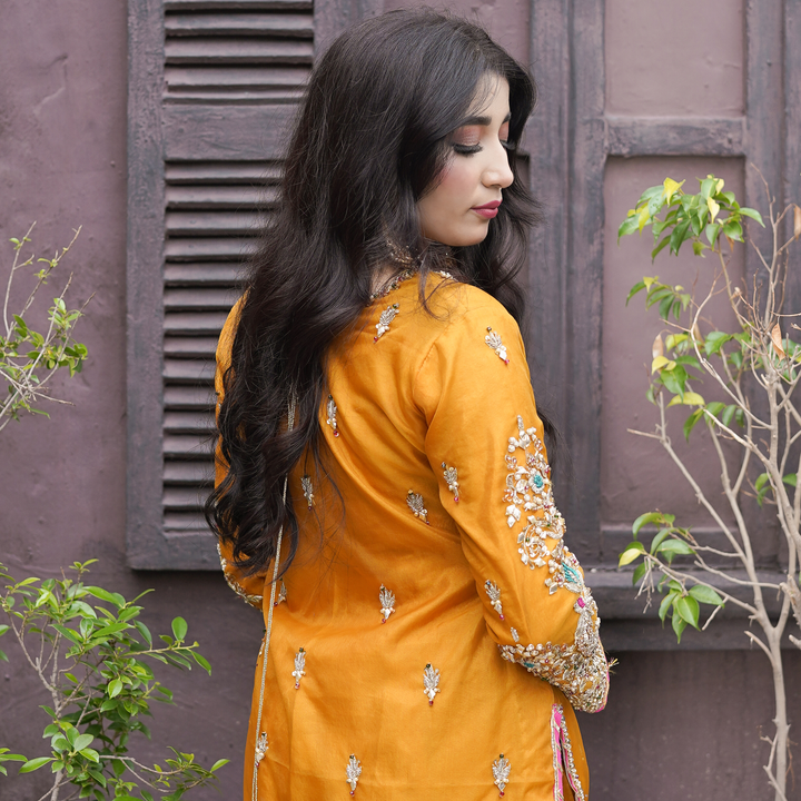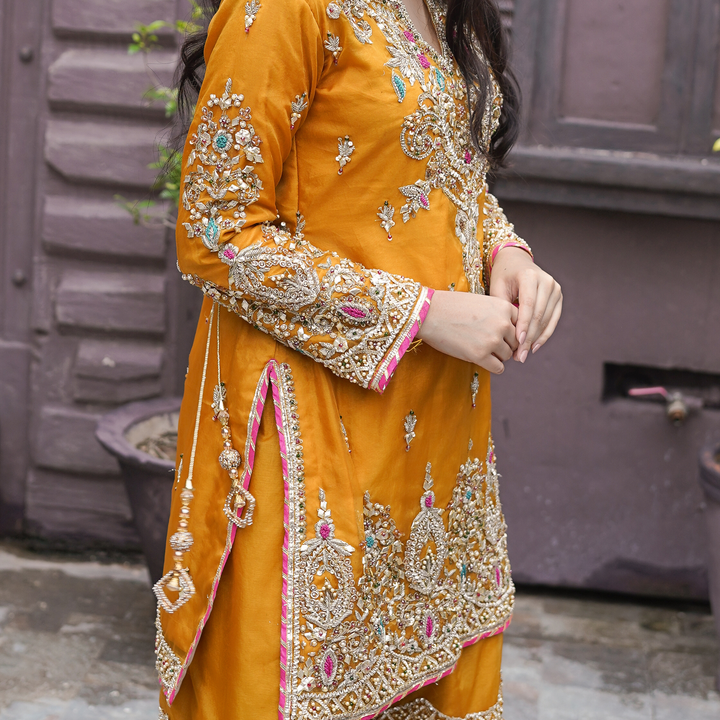 The gharara set embellished with gotta work, featuring detailed borders and a captivating neckline.The dupatta is crafted from organza with intricate embroidered applique and matching borders, combining texture and delicacy.