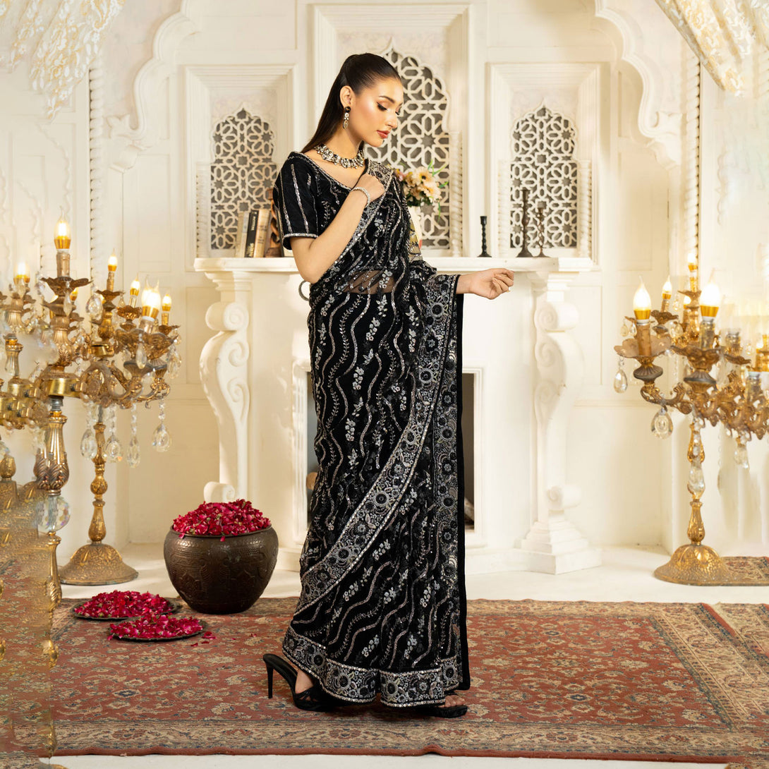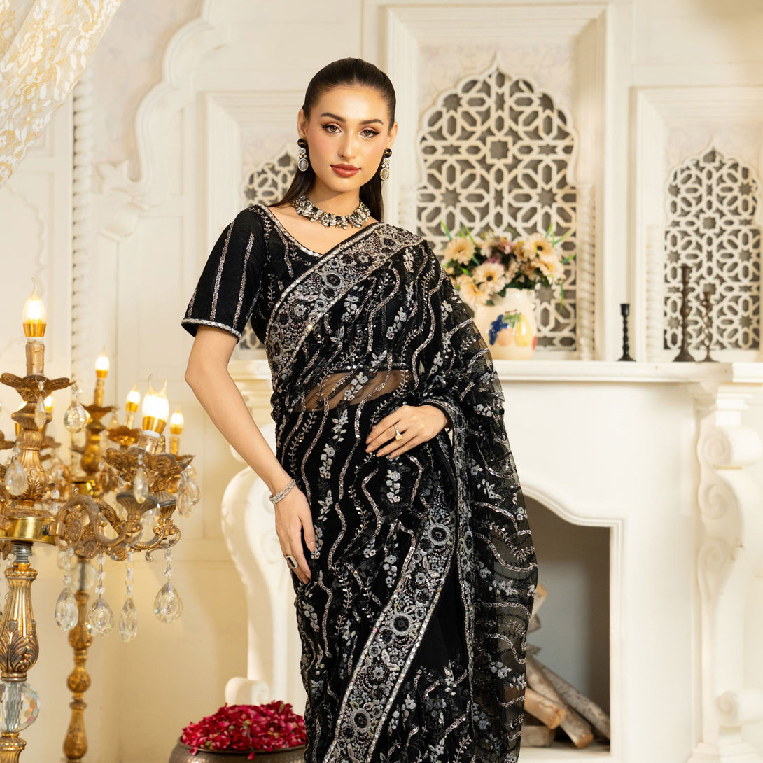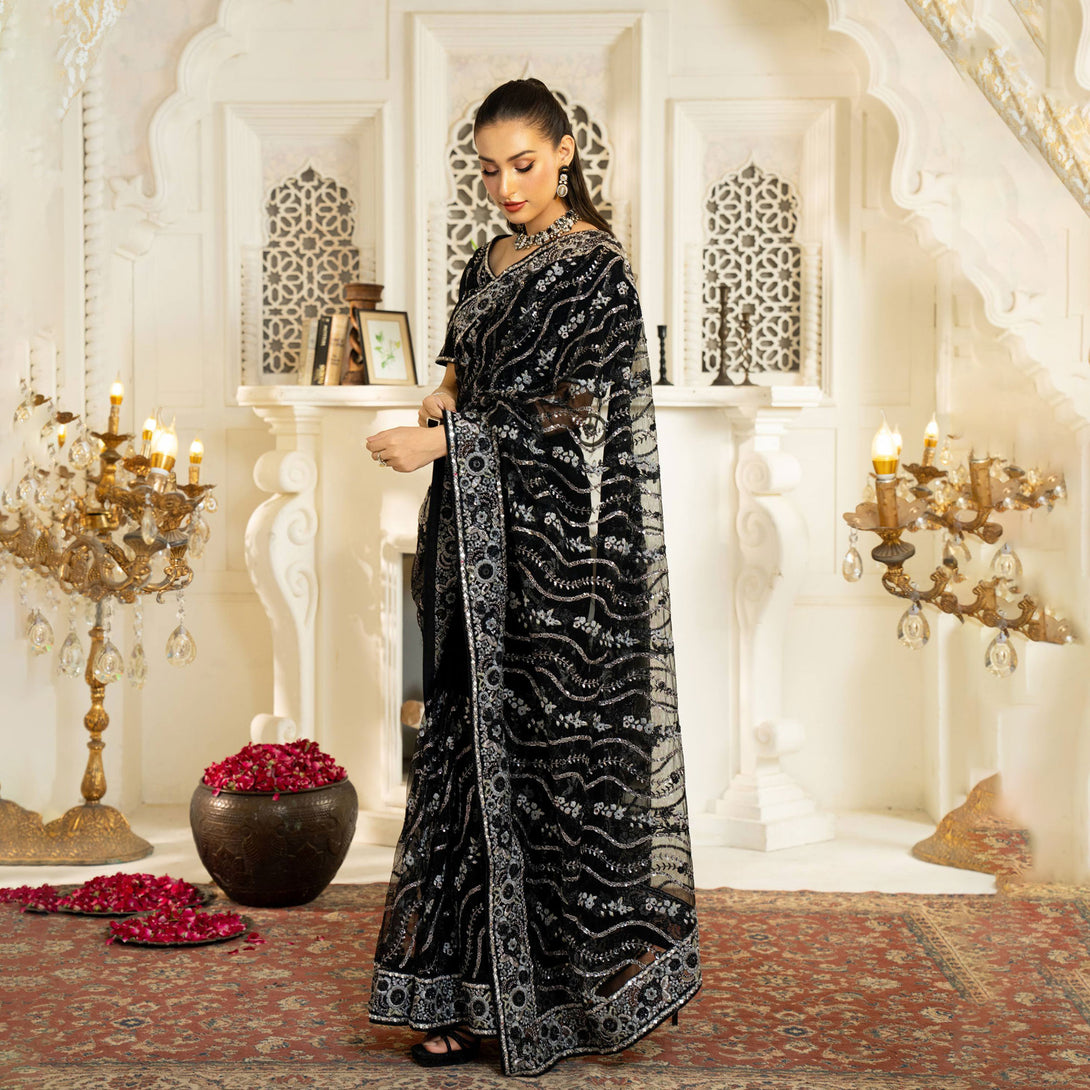 The meticulous details elevate the overall design, creating a luxurious and graceful look. A refined fusion of traditional craftmanship and modern sophistication, adorned with intricate work intermixed with delicate embellishments of sitara and thread that exude timeless beauty and charm.